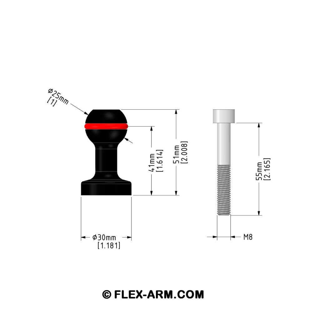 1″ Flex-arm pallokiinnike M8-ruuvilla. Pallokiinnikkeeseen voit kiinnittää ns. klämppejä ja niihin esim. kellukevarsia/valoja. Valmistettu teknopolymeerista.