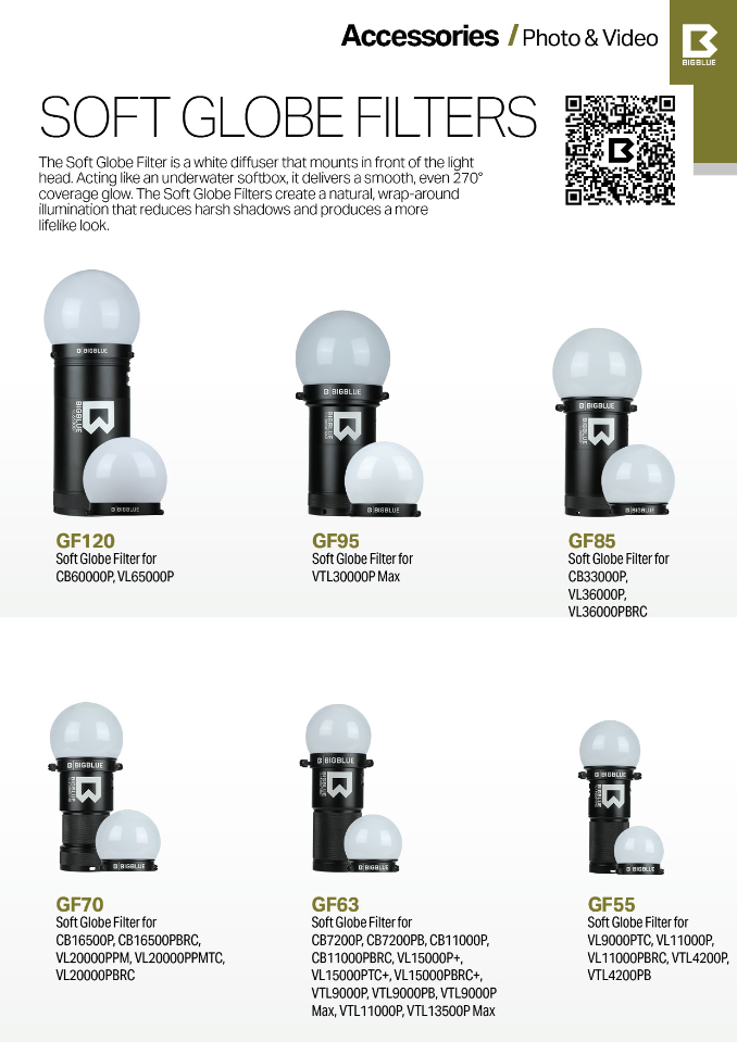 Bigblue Globe Filter pallodiffuusori kiinnitetään videovalon (CB, VL ja VTL) etuosaan. Sitä käyttämällä saat pehmeän ja tasaisen 270 asteen valokeilan. Pallodiffuusori luo luonnollisen ympäröivän valokeilan, joka vähentää voimakkaita varjoja.