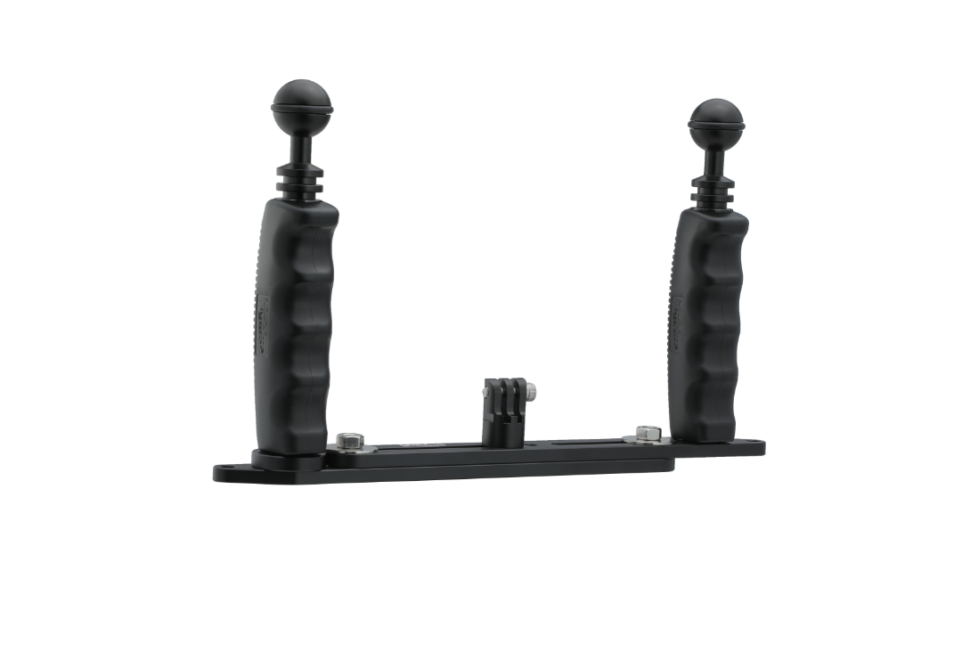 bigblue GoPro-telineen uusi malli on laadukas jatkettava alumiininen teline GoPro-kameroille. Laajennusvara 176-287 mm. Kahvojen päissä on 1″ pallot varsien tai valojen kiinnittämiseen.